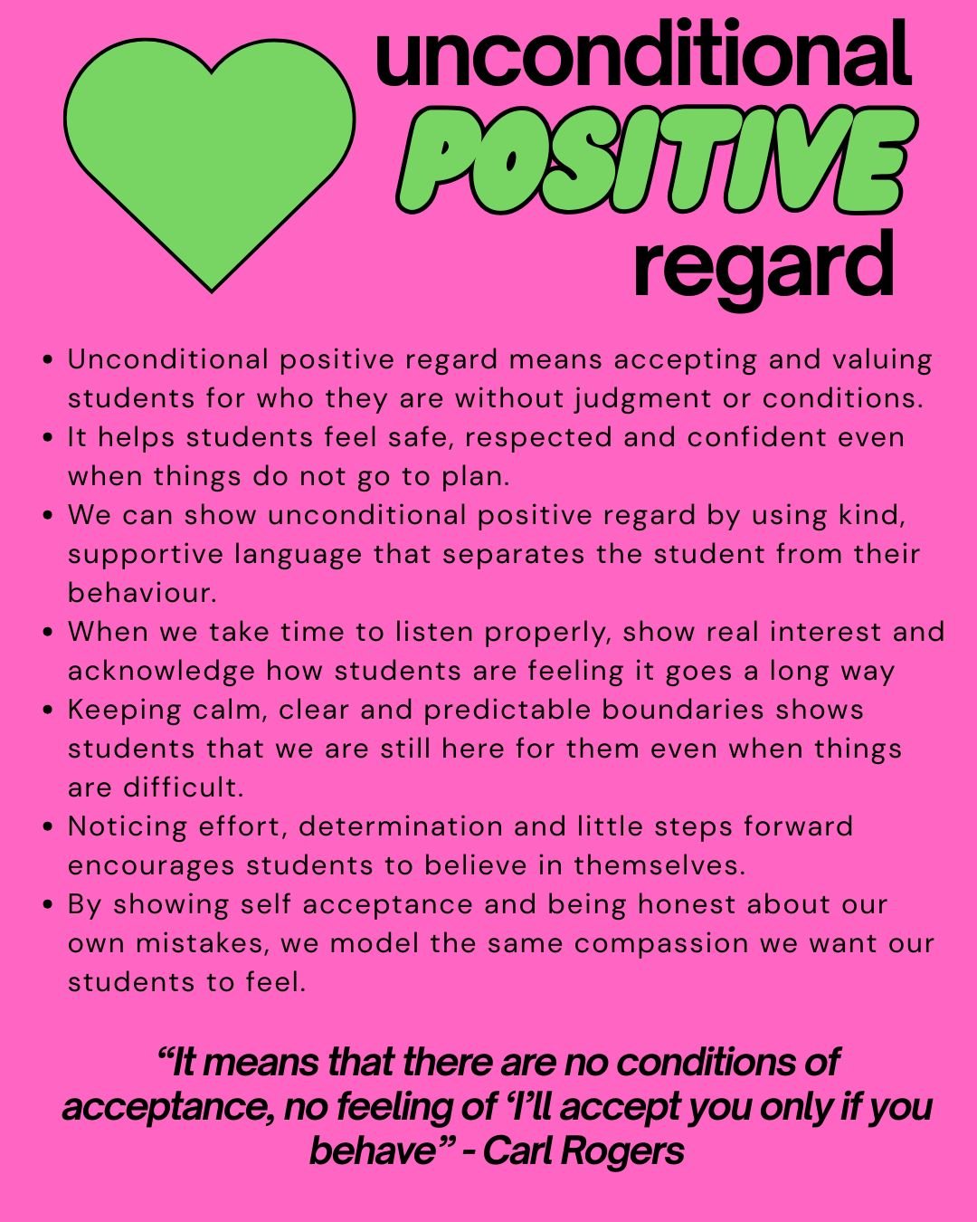 This excellent poster on Unconditional Positive Regard was created by Nicola Lace, Headteacher at Learning Partnership West CIC in Bristol.